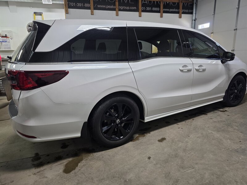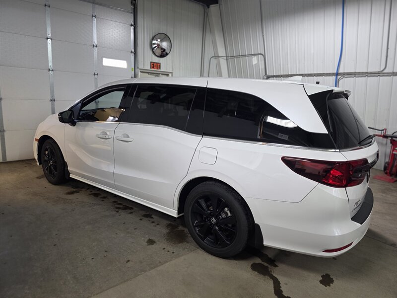 Factory-default features (aka the good stuff that comes straight from Honda’s blueprint): - Powertrain and driving basics: 3.5L V6 with 280 hp / 262 ft-lbs for confident highway passing and effortless merges. Smooth automatic transmission and front-wheel drive tuned for everyday comfort. - Honda Sensing suite: The full safety tech package that helps keep you out of awkward moments — adaptive cruise control, collision mitigation braking, lane-keeping assist, and road departure mitigation. It’s like a polite co-pilot that nags you only when necessary. - Seating and interior flexibility: Seating for up to eight with Honda’s clever second- and third-row configurations — Magic Slide second-row seating for easy aisle access and configurable passenger/child-seat arrangements, plus fold-away third-row seating for cargo day when life demands you move an ungainly object. - Climate comfort: Multi-zone automatic climate control so the driver, front passenger, and backseat jurors can each vote for their preferred temperature (results may vary). - Doors and tailgate convenience: Power sliding doors (handy for juggling car seats and groceries) and a power tailgate for loading cargo without performing circus-level balancing acts. - Lighting and visibility: Bright LED headlights and daytime running lights for clearer nighttime commutes and dramatic driveway arrivals. - Infotainment and connectivity: Intuitive touchscreen infotainment with Apple CarPlay and Android Auto compatibility, Bluetooth hands-free calling and audio streaming, and multiple USB ports to keep phones and tablets charged during long trips or spirited backseat negotiations. - CabinWatch and CabinTalk: Built-in rear-seat camera and intercom that let you monitor and speak to backseat passengers without turning into a contortionist. Yes, you can say “no snacks on the leather” without craning your neck. - Safety & driver aides: Multi-angle rearview camera and available blind spot monitoring with cross-traffic alert to help you exit the parking lot with dignity intact. - Comfort features: Power-adjustable front seats (with driver convenience features), supportive seating surfaces, and thoughtfully placed storage cubbies so everything — from sippy cups to secret chocolate stashes — has a home. - Exterior touches: Sport-specific styling cues and alloy wheels that give the Odyssey a slightly cheekier profile — because if you’re going to grocery-run, you might as well look good doing it.